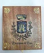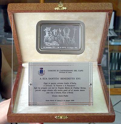 Targa in argento 800/1000 con LINGOTTO realizzato in ARGENTO 925/1000 peso Gr. 100 da mm 80 x 50 incastonato in struttura rotante. Dono a S.S. BENEDETTO XVI in occasione della sua venuta a Santa Maria di Leuca il 14 giugno 2008 commissionata dal Comune di Castrignano del Capo.